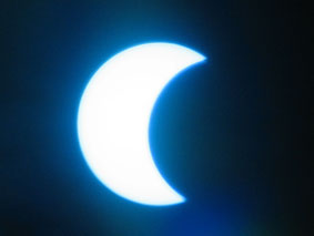![]() Marga de Weert uit Lelystad schrijft: "Hierbij een poging om de verduistering te fotograferen, door een gekleurd plastic en met sluierbewolking via een schaaltje water." |